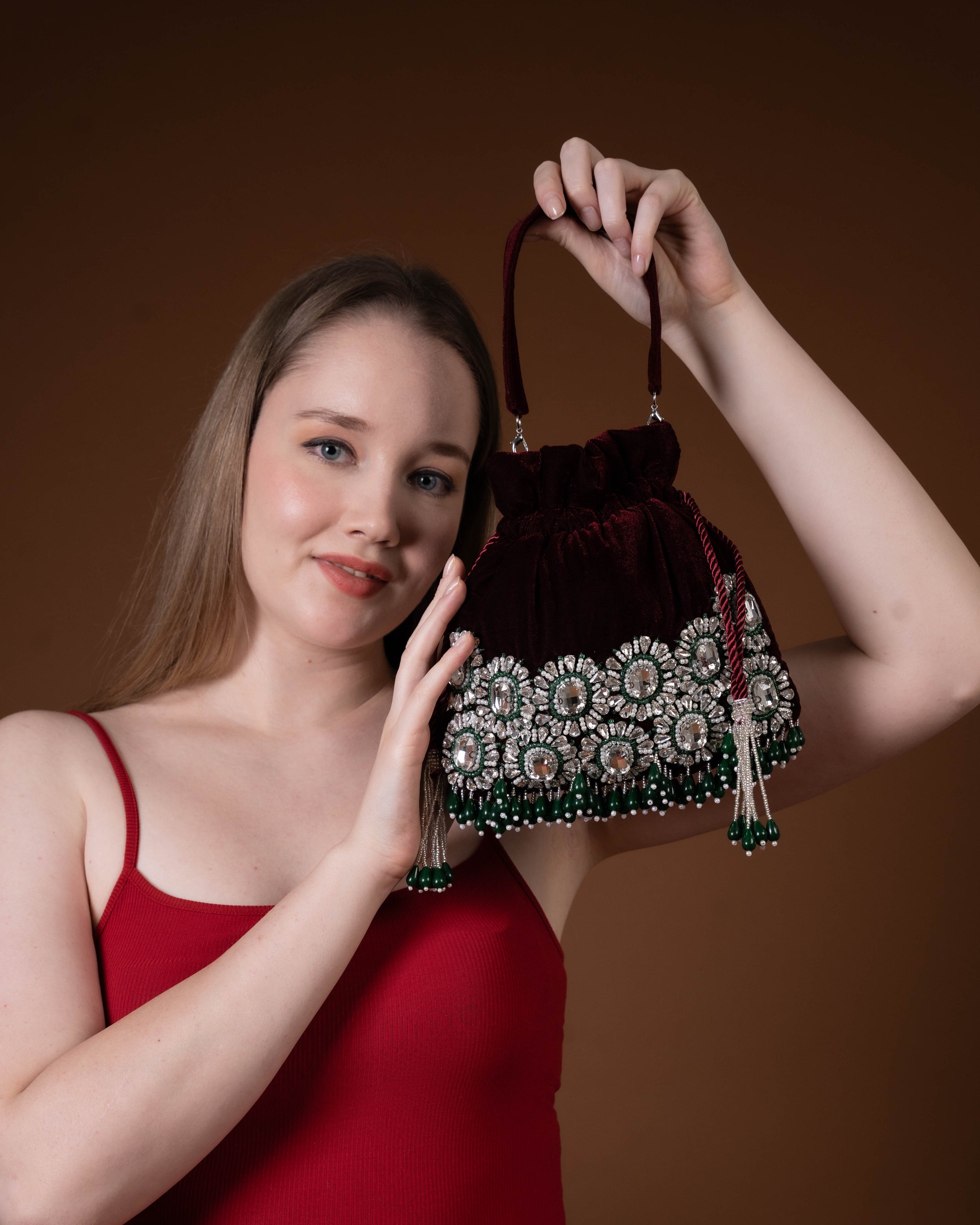 Rich in texture and regal in detail, the Ameera Velvet Emerald Potli is a luxurious blend of tradition and glamour. Handcrafted in deep maroon velvet, this potli features an ornate border of mirror-cut crystals, emerald-green drops, and intricate bead embroidery.
