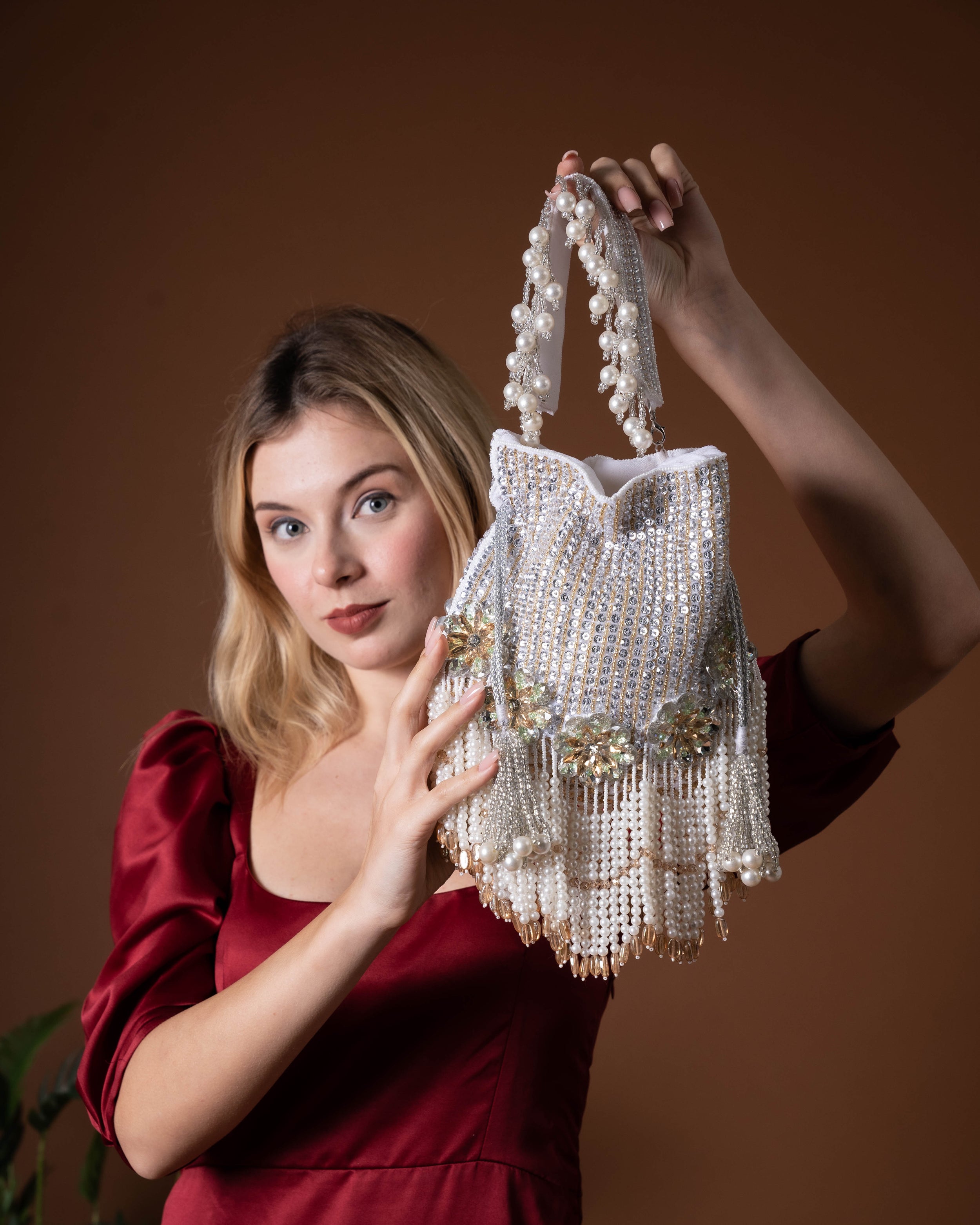 The structured silhouette, finished with an intricately beaded pearl handle, makes it the perfect companion for weddings, festive gatherings, or gifting moments that matter.