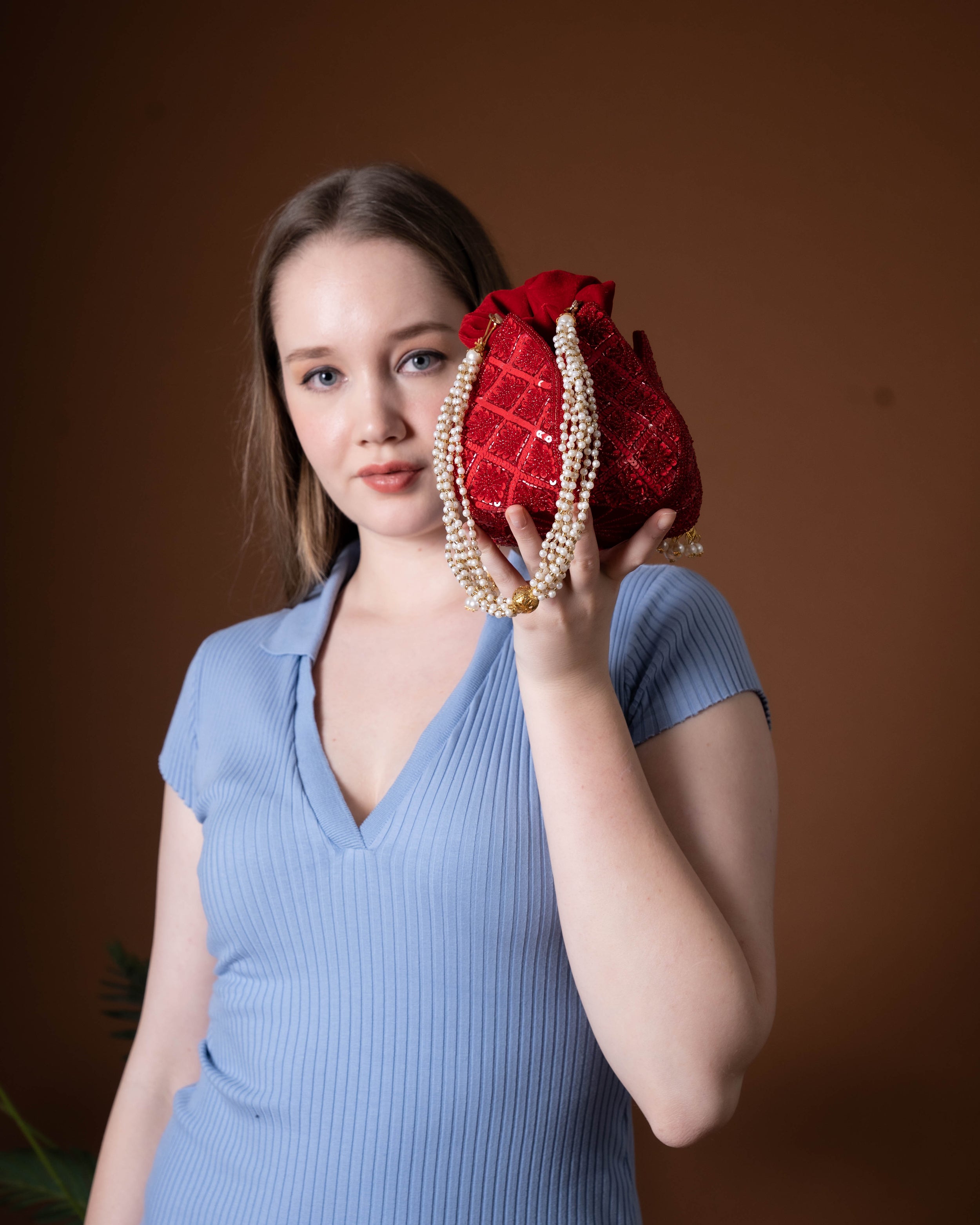 Elevate your festive look with the Scarlet Royale Sequin Potli — a stunning accessory drenched in vibrant red and dripping in traditional opulence. This handcrafted masterpiece features rich embroidery with sequin detailing in a classic lattice pattern, offering a bold and radiant aesthetic. Accentuated with a plush velvet drawstring top and elegant pearl-beaded handle, it’s the perfect companion for weddings, sangeet nights, or festive soirées. Each piece comes encased in our premium Veleso luxury dust bag and gift box for a luxurious experience.