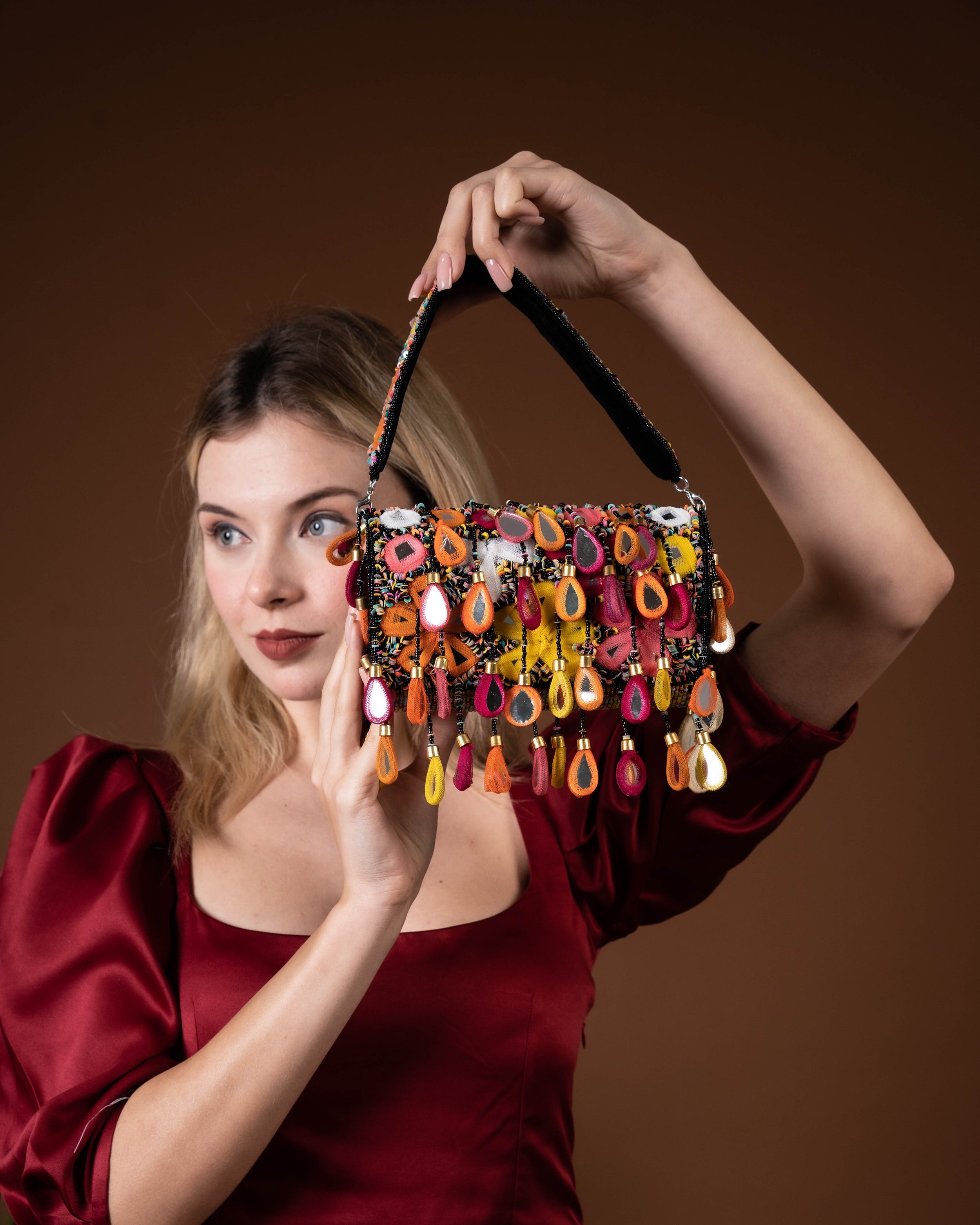 Step into the world of opulence with our Maharani Rasrang Embellished Flap bag— a vibrant masterpiece that captures the essence of festive elegance. Adorned with multicolored beaded embroidery, mirror accents, and dramatic tear-drop danglers, this Flap is perfect for weddings, sangeet nights, or any royal occasion. Each element is intricately hand-stitched to create a burst of colors and textures that celebrate Indian heritage with a modern twist. Comes with a soft satin lining and a secure drawstring closure for style and convenience.